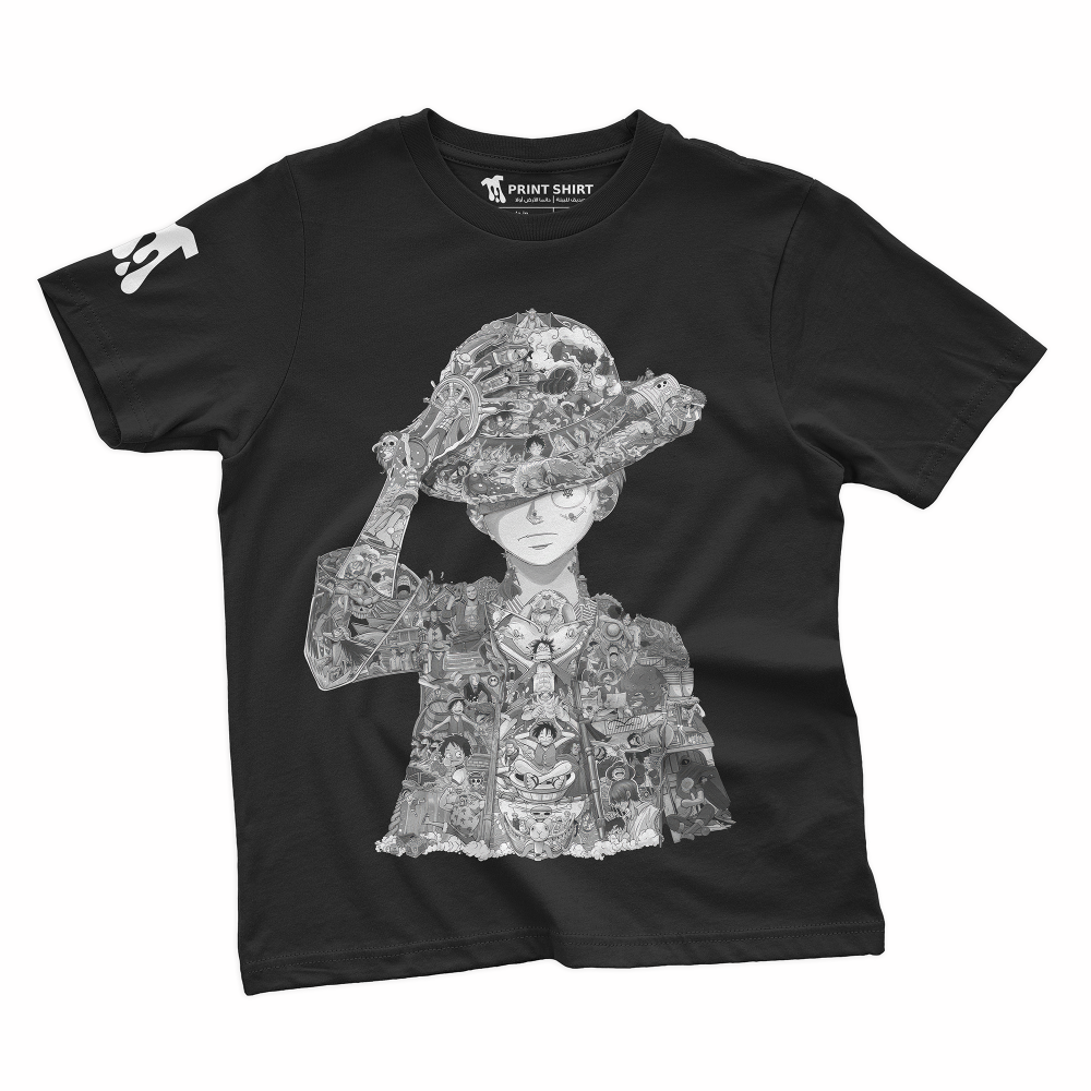 هذا التيشيرت يحمل صورة “لوفي” القائد الشجاع، لكنك إن اقتربت أكثر، ستكتشف أن ملامحه خُلِقَت من مشاهد عديدة عاشها في مغامراته مع طاقم قبعة القش.